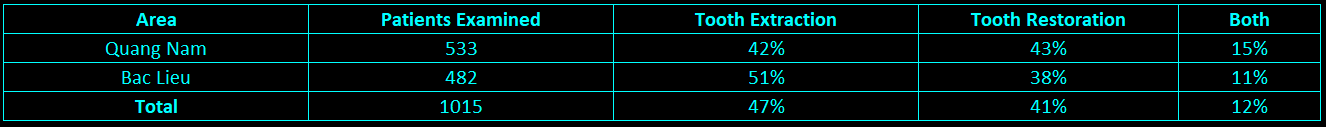 Dental treatment has been included as a service provided by Vietnam Vision Projects – Australia. A team of 22 volunteers from Australia were ably assisted by 12 volunteers from Vietnam. Following its introduction in 2011, the Dental team has adapted very quickly to the conditions in rural areas of Vietnam and performed with great distinction, as shown by the summary of results shown below. These figures are a summary of results and are a reflection of the team work and efficiency achieved by the dental group.
